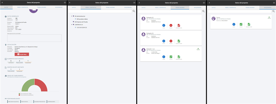 Como podemos ver, la primera pestaña que se muestra corresponde a los Datos del proyecto, donde podemos ver sus datos generales, localización, elementos gestionados (contratas, trabajadores y maquinaria), personal dentro en este instante, grado de cumplimentación y responsabilidades.
