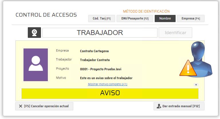 Independientemente de si el acceso es permitido o denegado, es posible mostrar un aviso en pantalla en el momento en el que va a entrar por el control de accesos. Este aviso se puede activar tanto en trabajadores como maquinaria, siendo la finalidad del mismo avisar a la persona del control de accesos de un dato relevante sobre el mismo. Para establecerlo, en función del elemento al que queramos activarlo, debemos de hacerlo desde la ficha del trabajador o en la ficha del inventario. En la siguiente imagen podemos ver como se muestra este aviso al darle acceso al elemento y cómo podemos apreciar, el hecho de ponerle un aviso obliga a realizar una entrada manual.