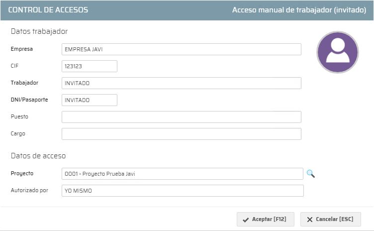 Otra opción es la entrada de Invitados, en los cuales la puerta de acceso puede ser configurada para que el responsable pueda registrar entradas de este tipo de trabajadores, de la misma manera que se puede solicitar (de manera obligatorio o no) que se realice una fotografía del trabajador y se imprima el carnet identificativo. Para ello, una vez se va a realizar la entrada manual se muestra una imagen similar a la siguiente pantalla: