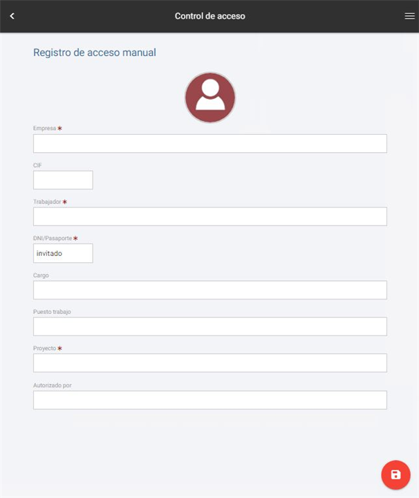 con el que el propio vigilante puede permitir el acceso a un trabajador que lo tiene denegado. Una vez que el vigilante haga clic en esta opción, se muestra la pantalla de datos adicionales que vimos anteriormente, salvo que en este caso el encabezado será de color rojo.