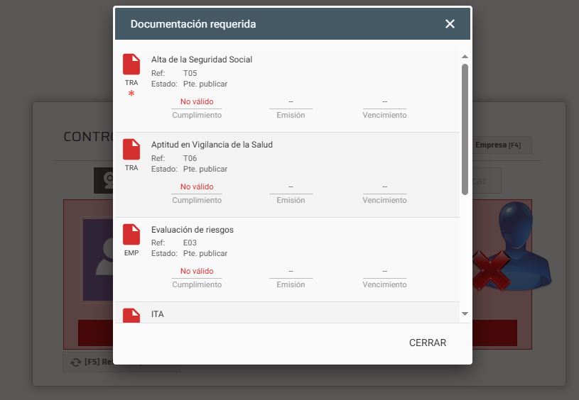 Como hemos comentado anteriormente, a través del control de accesos se verifican los requerimientos asociados al trabajador, y su empresa, para permitir el acceso a la obra. Dichos requerimientos pueden formar parte de la documentación general y la documentación del proyecto.