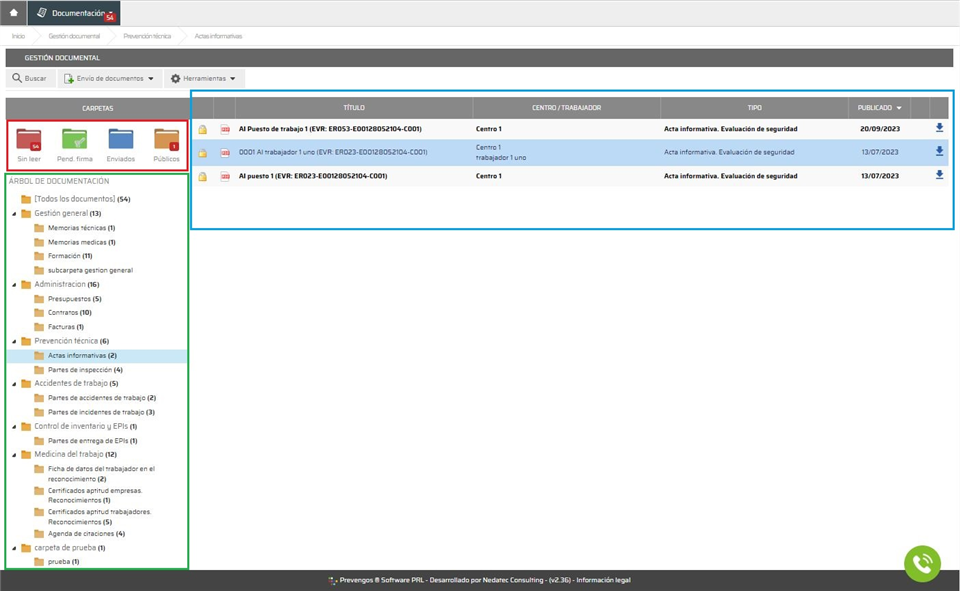 Dentro de ésta podemos ver diferentes partes que hemos resaltado con recuadros de color. Lo primero que podemos apreciar es las carpeta que clasifican los tipos de documentos, resaltado por un recuadro rojo, en el que podemos ver los documentos que el usuario tiene sin descargar, los que tiene pendiente de firma, los que ha enviado al SP y los públicos. De manera aclaratoria diremos que los documentos que están sin descargar se muestran en negrita en el listado de documentación, tal y como podemos ver en la parte central.