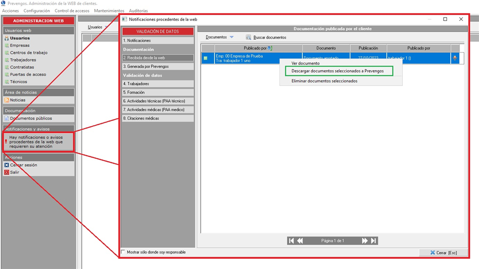 Dentro de esta ventana el usuario establece un título, una fecha y añade el documento que quiere enviar al SP. Tras hacerlo, un trabajador del SP con acceso al módulo web podrá ver este documento e incluso añadirlo a la documentación adjunta del elemento del que proceda para que quede guardado en Prevengos. Para poder realizar este proceso, desde el módulo web debe de acceder a las opciones que vemos en la siguiente imagen: