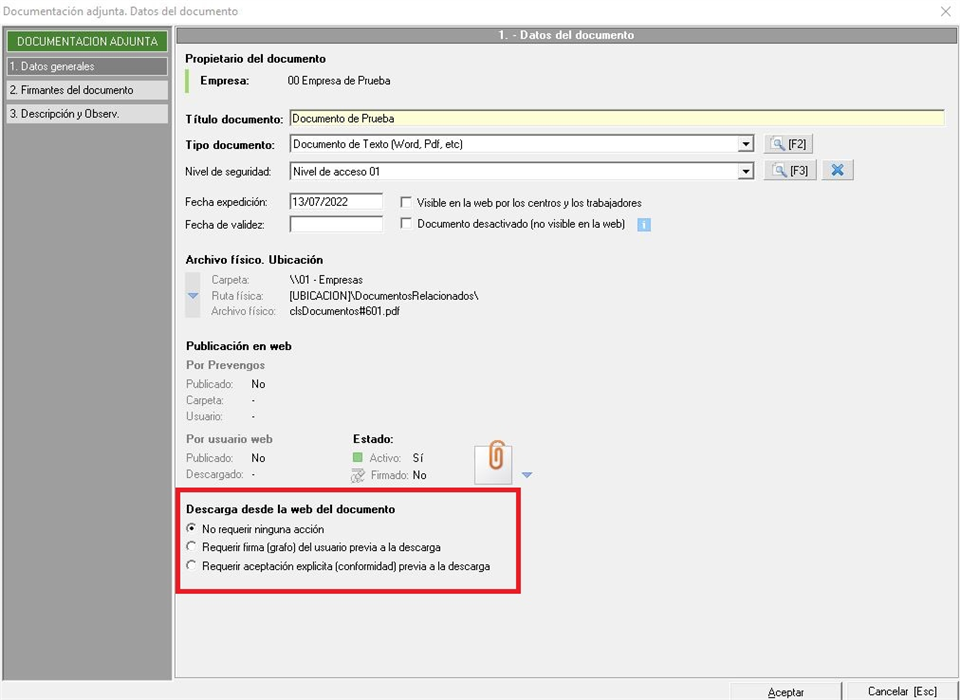 Como podemos ver en la imagen superior, apreciamos la ficha de un documento adjunto a una empresa (en caso de un trabajador o centro de trabajo sería lo mismo). En la parte inferior, resaltado con un recuadro rojo, podemos ver estas opciones mediante las cuales podemos indicar que se solicite la firma para descargar, que se solicite la aceptación de conformidad antes de descargarlo o que directamente no se solicite ninguna acción y el documento se descargue directamente. Además, para que estas opciones tengan efecto el documento, ya se adjunto o generado, debe estar publicado en la web previamente.