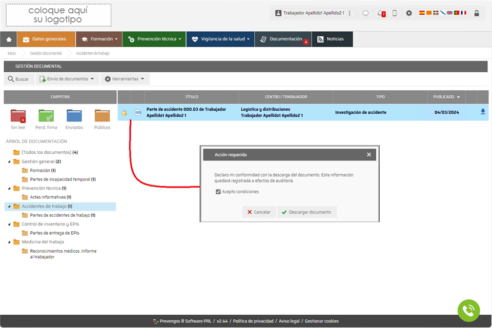 Podemos configurar Prevengos para que cuando descargamos un documento, ya sea un documento generado por Prevengos o adjunto, nos solicite la firma e incluso, la aceptación (conformidad) previamente a la descarga. Todo lo referente a esta configuración y a la firma del mismo en el momento de descargar está explicado en el manual de certificado de descarga, centrado en los documentos generados por Prevengos. Cuando se trata de un documento adjunto al elemento, estas opciones las encontramos en la ficha del mismo, por lo que tendremos que habilitarlo manualmente en el momento de añadir el documento.