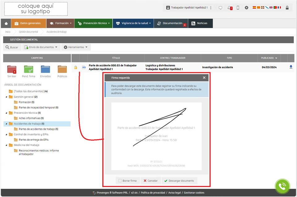 Las descargas se auditan desde el módulo web y puede generar un informe de certificado de descarga en el que se incluya el grafo de la firma o, en su defecto, la aceptación de conformidad de descarga.