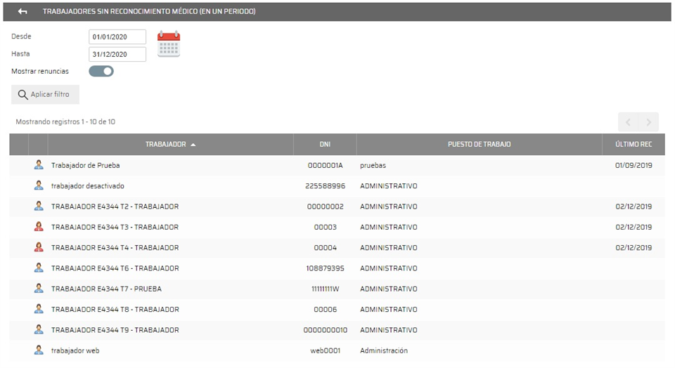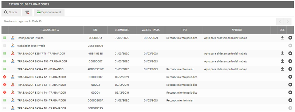 En este listado se muestra toda la información relacionada con los reconocimientos médicos de los trabajadores. Mediante el icono mostrado a la izquierda del nombre nos indica el estado del trabajador, pudiendo ser: