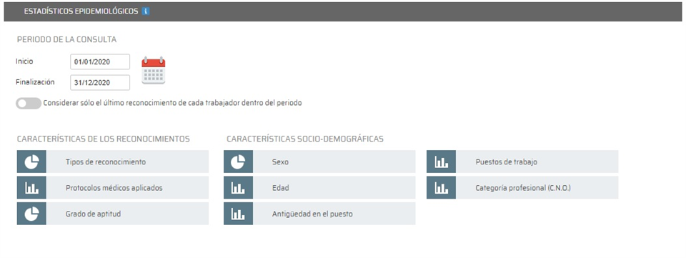 En esta pantalla establecemos los rangos de fechas que se tendrán en cuenta para hacer el estadístico. Nos permite también tener en cuenta solo el último reconocimiento de cada trabajador o todos los que tenga. Por último solo queda hacer clic en los diferentes botones para que se muestren las estadísticas de los mismos, tanto de manera numérica como gráfica, estando disponibles: