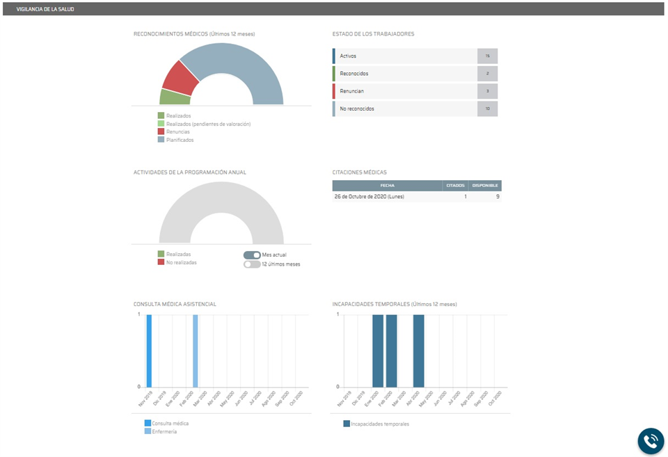 Como podemos apreciar la pantalla principal del módulo de vigilancia de la salud es muy informativa, pudiendo ver gráficas sobre reconocimientos médicos en los últimos 12 meses, actividades de la programación anual (mes actual o los últimos 12 meses), consultas médicas asistenciales médica o enfermería, Incapacidades temporales en los últimos 12 meses, Citaciones médicas programadas y el estado de los trabajadores en reconocimientos médicos (activos, reconocidos, renuncias y no reconocidos).