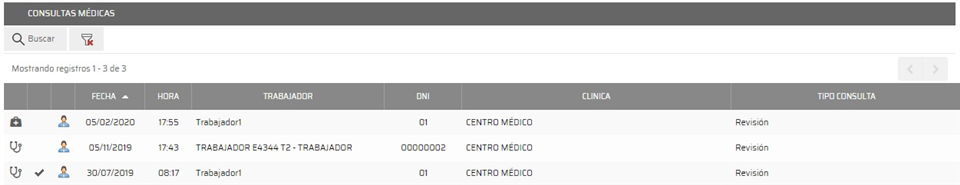 En el resto del listado vemos la fecha de la consulta, hora de la misma, nombre del trabajador, DNI, clínica y el tipo de consulta. Como en otras herramientas de la web, disponemos del botón