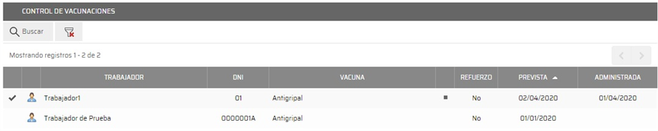 aquellas que han sido administradas al igual que los datos relativos al trabajador, DNI, vacuna, si es una vacuna obligaroría (icono de un cuadrado negro), si es refuerzo, fecha prevista y fecha de la administración.