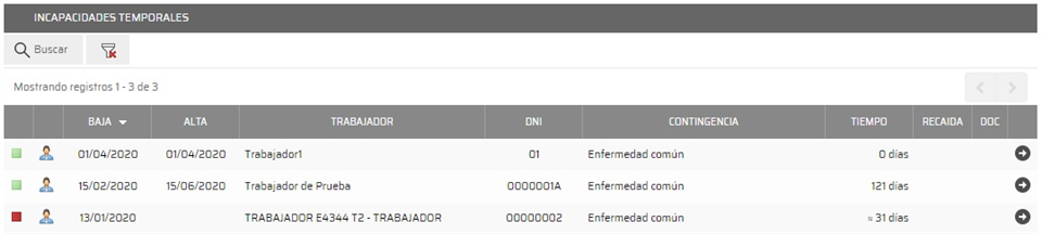 Accedemos a la parte de incapacidades temporales del área de Prevengos donde tenemos registradas todas aquellas incapacidades de los trabajadores. El listado de trabajadores lo vemos como en la siguiente imagen:
