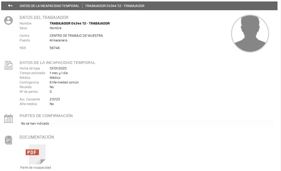 Como podemos apreciar, podemos ver datos relativos al trabajador (nombre, sexo, puesto de trabajo, ...), relativos a la incapacidad temporal (fecha de baja, tiempo estimado, médico, ...), los partes de confirmación y el parte de incapacidad, siempre que hayan sido generados y publicados en Prevengos.
