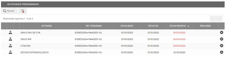 para realizar consultas filtrando por el nombre de la actividad, responsable de actuación y el estado de realización. En el listado distinguimos el nombre de la actividad, la referencia del programa de actividades al que pertenece, fecha de inicio y fin, fecha prevista y la fecha de realización (si está realizada, que por defecto no se mostrara en el listado al entrar)