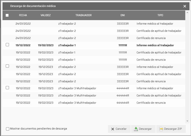 Se nos abrirá la siguiente ventana , dónde podremos seleccionar la documentación que queremos descargar de los trabajadores reconocidos. Nos permitirá descargarla en PDF o en archivo zip.