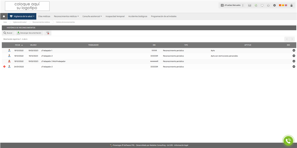 Herramienta muy similar a la anterior donde encontraremos un listado de los trabajadores de la empresa que han tenido algún reconocimiento. El usuario puede ver la fecha del último reconocimiento, la fecha de validez, nombre del trabajador, su DNI, el tipo de reconocimiento, el criterio de aptitud y la posibilidad de descargar el certificado de aptitud si ha sido publicado previamente. En la parte superior izquierda tenemos el botón