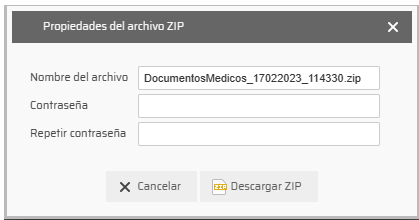 Si queremos descargar los documentos en archivo zip, se nos habilitará la siguiente ventana para establecer una contraseña con el fin de proteger los datos médicos sensibles. La contraseña establecida se volverá a solicitar cuendo se estraigan los documentos zip al equipo.