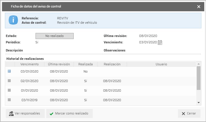 En la ficha del aviso de control podemos comprobar si esta o no realizado, las fechas de revisión y vencimiento, el historial, los responsables del aviso de control y la posibilidad de marcar como realizado en caso de que no lo esté.