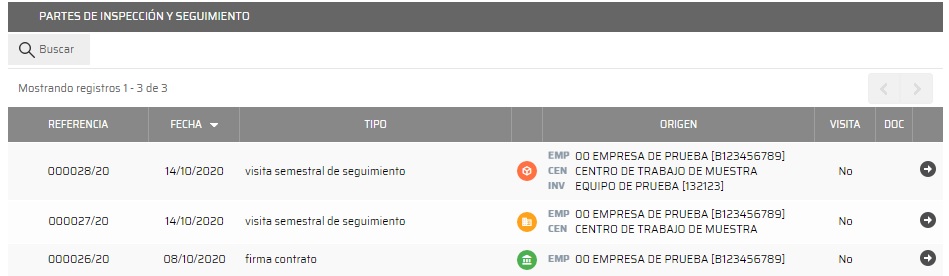 Podemos ver el número de referencia, fecha, tipo, origen del parte, si tiene visita contabilizada y el documento en caso de que haya sido publicado.