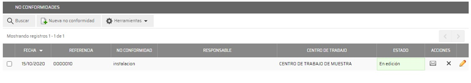 con herramientas para comunicar la no conformidad (icono de sobre), eliminar la no conformidad (icono X) o editarla (icono de lápiz). Estas mismas herramientas las tenemos disponible en el desplegable