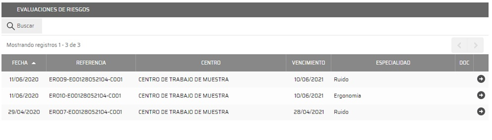 para filtrar las evaluaciones por rangos de fechas (evaluación y planificación), centros de trabajo o especialidad. Al igual que en el apartado anterior, si hacemos clic sobre una accederemos a su ficha donde podemos consultar los datos generales, riesgos, EPIs, señales, formación, información y planificación de medidas.