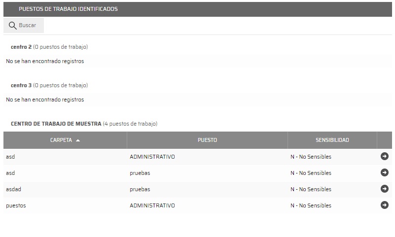 Accedemos en esta parte a un listado de todos los puestos de trabajo que hayan sido evaluados. Se catalogan por centro de trabajo, tal y como vemos en la siguiente captura:
