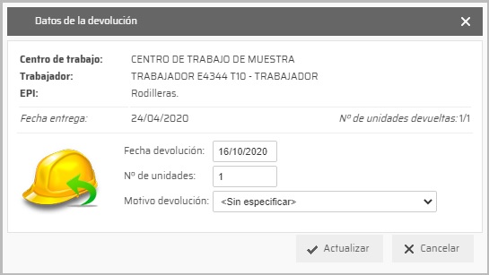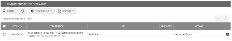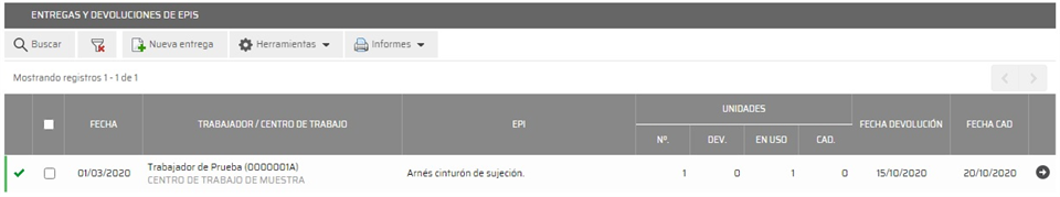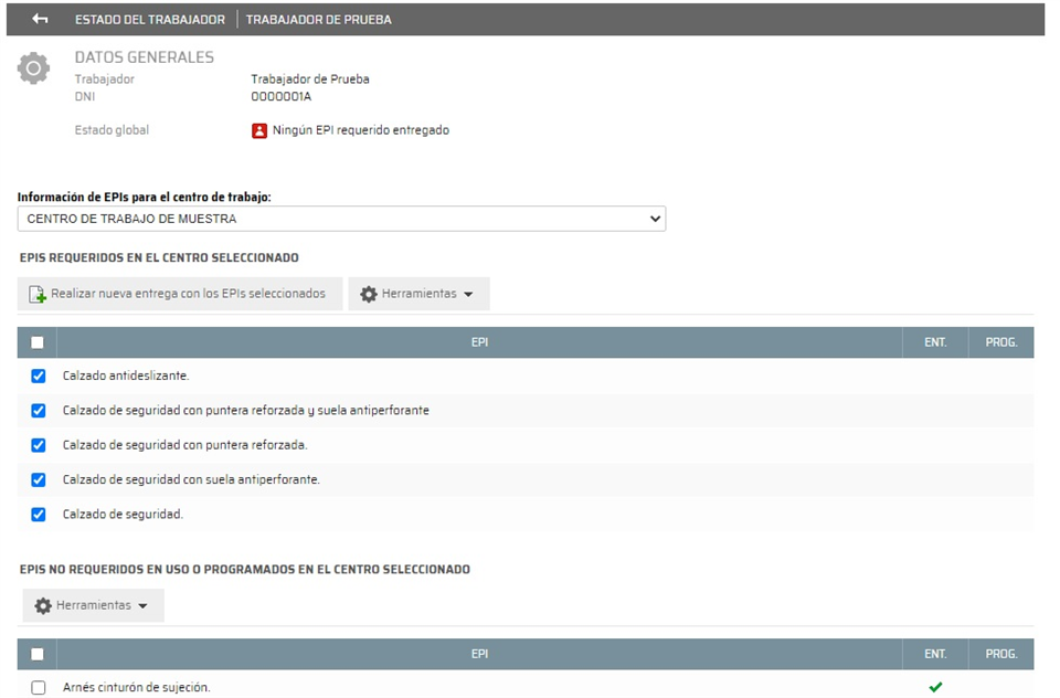 Disponemos de un listado de los EPIs entregados, requeridos o en uso. En el caso de los requeridos encontramos el botón "Realizar nueva entrega con los EPIs seleccionados" para realizarle la entrega o, en caso de que ya los tenga, marcarlos como entregados desde el desplegable