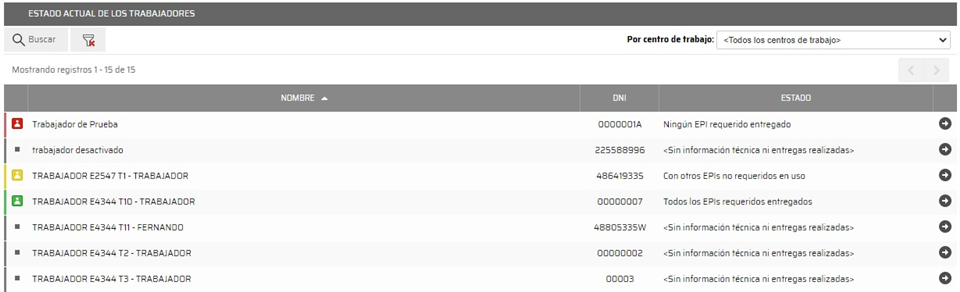 Existen cuatro tipos de estado que se especifican con el icono situado a la izquierda del nombre del trabajador. El icono verde es cuando todos los EPIs requeridos están entregados y en vigor en el trabajador, icono amarillo cuando le falta algún EPI y icono rojo cuando le faltan todos los EPIs requeridos. El icono con cuadrado negro se muestra cuando no hay información relacionada con ese trabajador (no está evaluado).