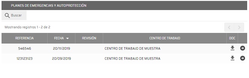 para realizar una consulta filtrando por un rango de fecha de realización, rango de fecha de revisado o centro de trabajo. El listado nos muestra la referencia del plan de emergencia, la fecha de creación, fecha de revisión (si procede), descargar el documento en caso de que haya sido publicado y acceder a la ficha del mismo. En caso de que hagamos clic sobre el plan de emergencia accedemos a la ficha del mismo donde podemos comprobar los datos generales, observaciones y descargar el documento publicado previamente.