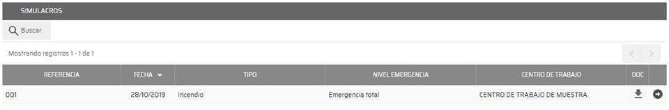 En el listado nos informa de la referencia del simulacro, fecha, tipo, nivel de emergencia, centro de trabajo y la posibilidad de descargar el documento si ha sido generado previamente. Disponemos en la parte superior izquierda del botón