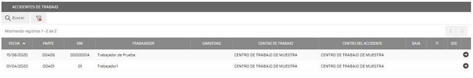 Podemos ver la fecha del accidente, número de parte, DNI del trabajador, nombre del mismo, gravedad, centro de trabajo, centro del accidente, si causa baja o IT y el documento del parte de accidente si ha sido publicado previamente. En la parte superior izquierda tenemos el botón