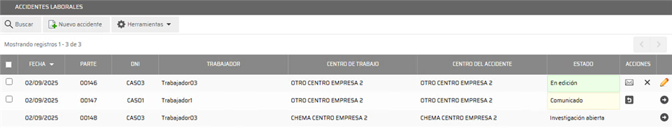 En el listado podemos ver la fecha de creación, el número de parte, DNI y nombre del trabajador, centro de trabajo, centro donde se produce el accidente, estado del accidente, que puede ser "En edición", "Comunicado" o "Investigación abierta" y acciones que dependerán del estado del accidente.