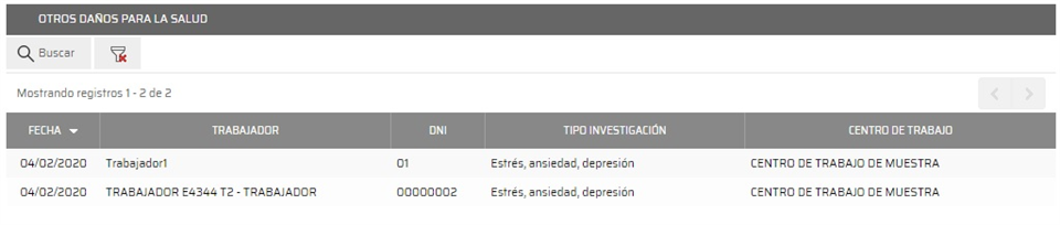 Dentro de esta herramienta se nos muestran, a nivel informativo, todos los registros hechos en Prevengos como otros daños para la salud, mostrándose un listado con los mismos tal y como vemos a continuación: