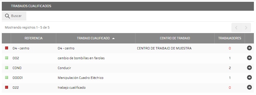 Los trabajos cualificados son aquellas labores que registramos en Prevengos y que se especifican unos requerimientos de formación, carnets y cualificaciones para que nos muestre aquellos trabajadores que cumplen los requisitos y pueden ejercerlo. (Si necesita más información sobre dar de alta trabajos cualificados pinche aquí) Se muestran en una lista similar a esta: