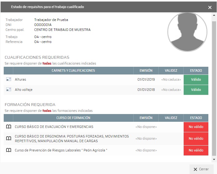 Este diálogo nos muestra aquellos requerimientos del trabajo cualificado y en los que el trabajador cumple/no cumple ya sea por no tenerlo o por estar caducado (en caso de un carnet o formación).