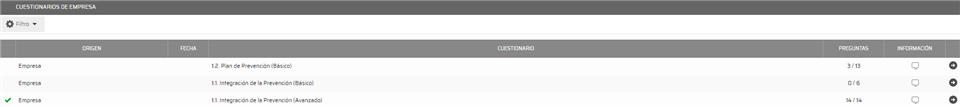 A través de esta herramienta accederemos a todos los cuestionarios que se hayan introducido a la empresa y se hayan habilitado para que se visualicen en la web. Igualmente, en la pantalla principal de Prevención técnica existe un acceso directo a los cuestionarios generales en la parte inferior derecha. Es importante comprobar los permisos del usuario web de empresa, así como también se ha de comprobar si hemos publicado dichos cuestionarios en la web. Debe tener en cuenta que los cuestionarios se pueden publicar sólo para visualizarlos o para que se puedan cumplimentar desde la web.