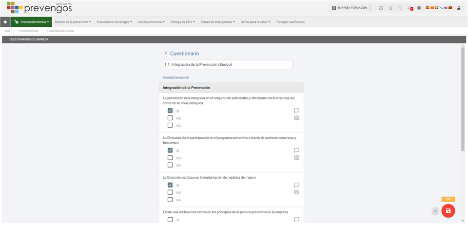 Mención especial a la barra de herramientas superior (gestión de la prevención, evaluaciones de riesgos,...) donde encontramos diversos desplegables con acceso a herramientas que iremos tratando de manera individual en este manual.