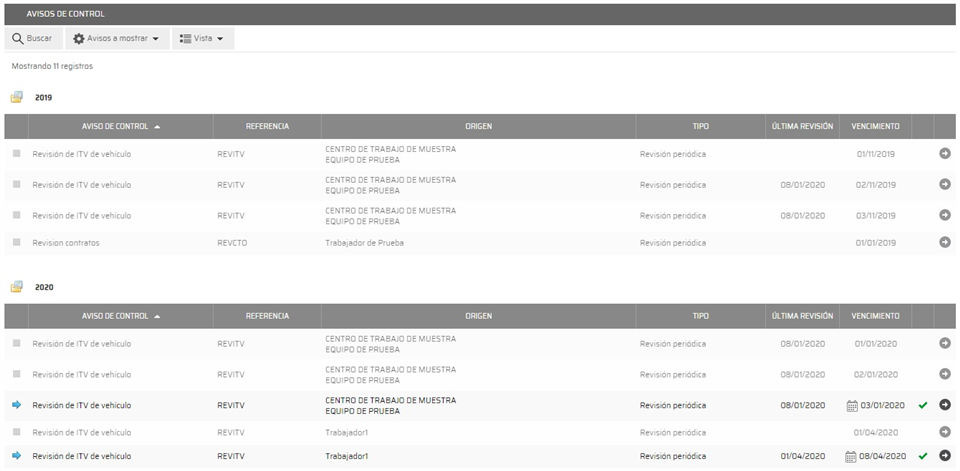 Con esta opción situada en la parte superior izquierda podemos filtrar los avisos de control en función del tipo, origen, rango de fechas de vencimiento, rango de fechas de última revisión y opciones de visualización (mostrar solo periódicos, mostrar la última revisión de los periódicos o solo elementos pendientes de realizar).