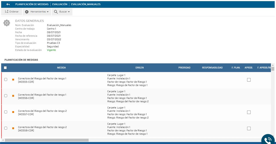 - Planificación de medidas. Accedemos a la herramienta de planificación de la evaluación, en la cual veremos un listado de todas las medidas tal y como vemos en la siguiente imagen: