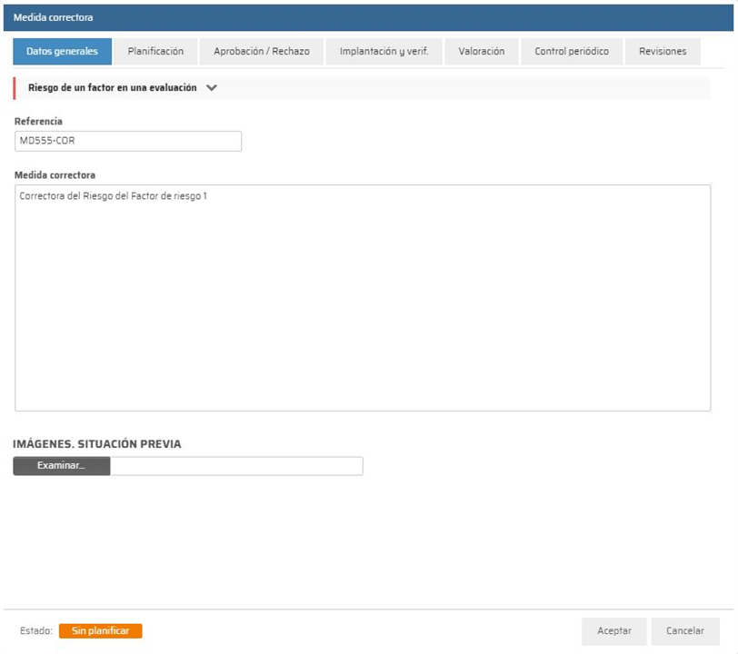 Lo que tenemos en pantalla no deja de ser la ficha del elemento, tal y como vimos en este manual sobre la gestión de la planificación, ya que realmente podremos hacer lo mismo que en Prevengos. Va a depender de los permisos que tenga el usuario web, pero podemos llegar a configurar todo sobre la planificación, aprobación, implantación, verificación, valoración, control periódico y revisiones, asi como los responsables de los mismos.