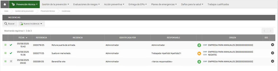 En el listado podemos ver la fecha de creación, el número de parte, DNI y nombre del trabajador, centro de trabajo, centro donde se produce el incidente, estado y acciones de la misma manera que aparece en el apartado de accidentes. En la parte superior tenemos el botón
