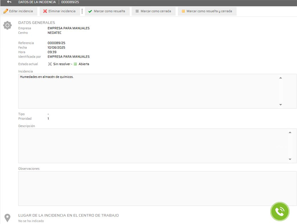 Si el usuario web empresa tiene permisos de control total sobre las incidencias, en la ficha de la incidencia (haciendo doble click sobre la misma o pulsando sobre
