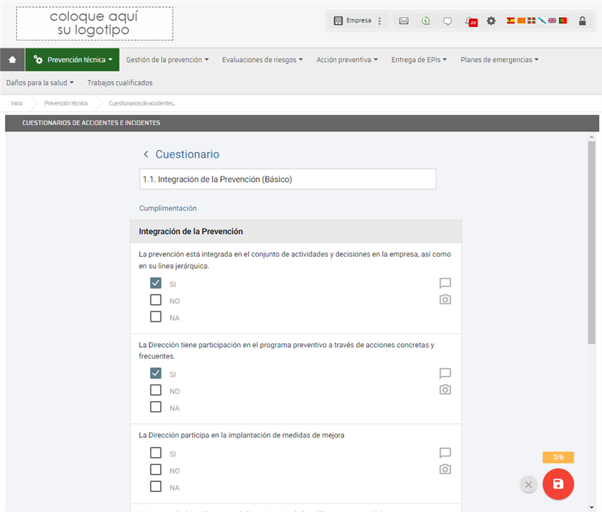 Por último tenemos tres bloques de accesos directos, tanto a elementos del área técnica (evaluaciones, partes de inspección, no conformidades,...), como a herramientas para crear nuevos accidentes, incidentes, entrega de EPIs y no conformidades, además de los cuestionarios generales o de accidentes/incidentes.