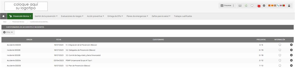 Desde esta herramienta accederemos al listado de cuestioanarios que se hayan aplicado a los accidentes o incidentes y se hayan habilitado para que se visualicen en la web. Igualmente, en la pantalla principal de Prevención técnica existe un acceso directo a los cuestionarios de accidentes o incidentes en la parte inferior derecha.