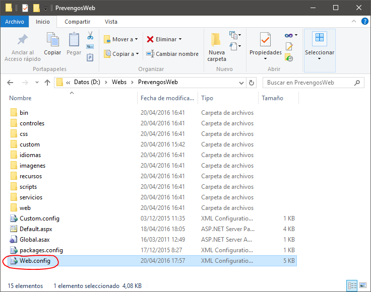Para llevar a cabo esta tarea ha de localizar el archivo "web. config", ubicado en el directorio raíz en el cual se ha instalado la web. Cualquier editor de texto permite la apertura del fichero (bloc de notas, notepad++, etc.).
