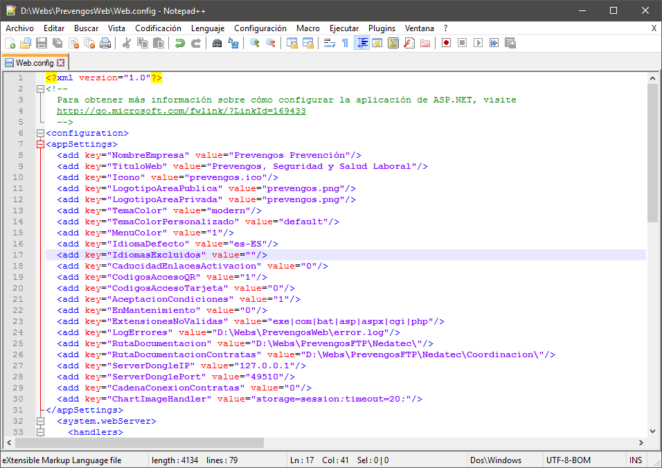 Tras abrir el archivo "web .config" con un editor de texto encontrará lo siguiente:
