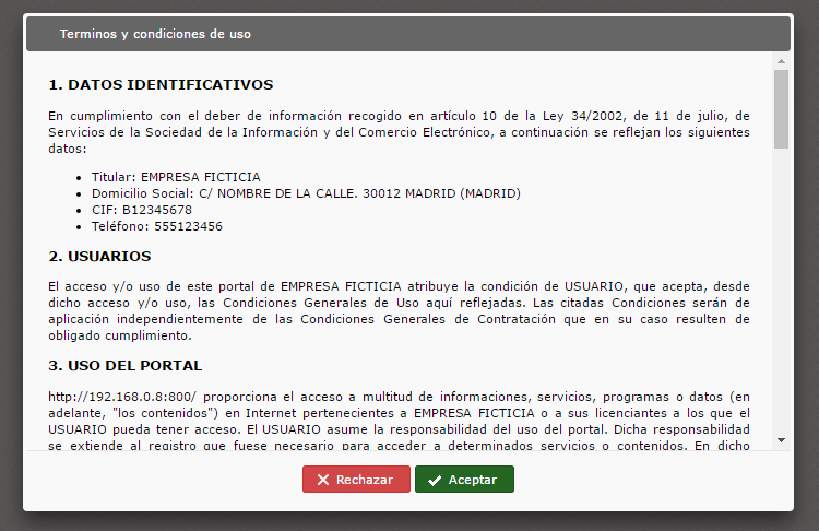 El portal web dispone de unos textos por defecto para mostrar en los términos y condiciones, pero se recomienda que sean reemplazados por los propios, o al menos revisados para verificar que la información que se muestra es correcta.