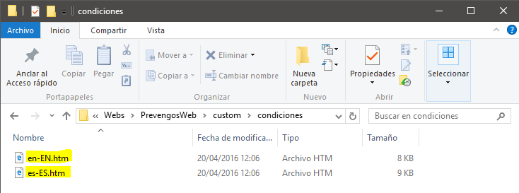 Estos ficheros se generan automáticamente la primera vez que se muestran los términos y condiciones en la web, por lo que, si al acceder a dicha carpeta no encuentra los ficheros o la propia carpeta, tendrá que entrar en la web validando un usuario (en todos los idiomas).