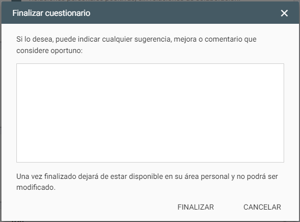 . En el caso de no querer aportarlas, tendrá que pulsar dicho botón para la finalización del cuestionario.