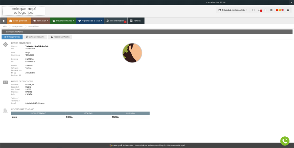 En este apartado se mostrarán los datos generales del trabajador tales como el nombre, el DNI, el puesto de trabajo que tiene asociado, sus datos de contacto, etc. En el caso de la versión 'PC' encontrarán tres pestañas. 'Datos generales', 'Datos contractuales' y 'Trabajos cualificados'. En el primer apartado 'Datos generales', se visualizan los datos básicos del trabajador, nombre, DNI, datos de contacto, o los centros de trabajo con los que está relacionado.